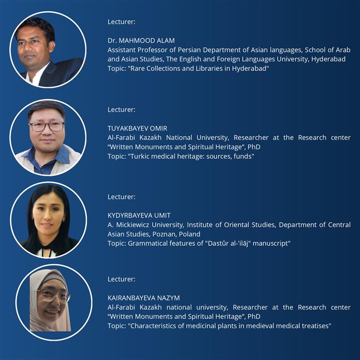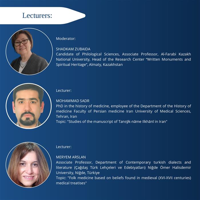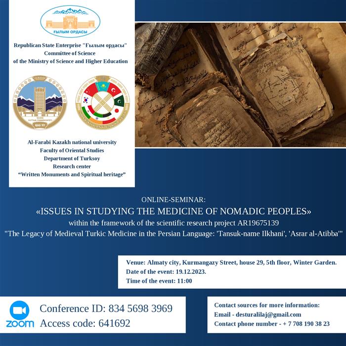 An ONLINE SEMINAR will be held on December 19, 2023: "PROBLEMS OF RESEARCH OF MEDICINE OF NOMADIC PEOPLES" within the framework of the scientific research project AR19675139 "The legacy of medieval Turkic medicine in Persian sources: "Tansuk-nam Ilkhani", "Asrar al-Atibba'". The format of the event is a mixed format. ID: 834 5698 3969 Code: 641692. The event is held within the framework of the SDGs quality education.