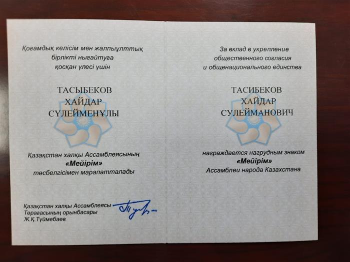 Dean of the Faculty of Chemistry and Chemical Technology, Associate Professor of the Department Tasibekov Kh.S. awarded with the sign "Mercy" of the Assembly of the Kazakh people. Congratulations!