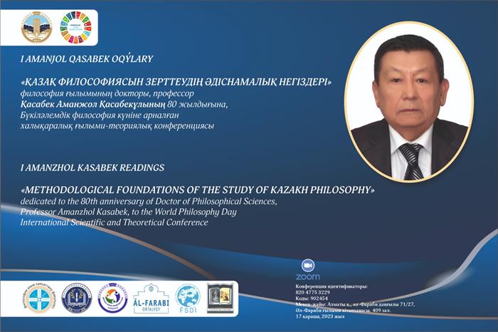 On November 17, 2023, we invite you to take part in the International Scientific and Practical Conference "METHODOLOGICAL FOUNDATIONS OF THE STUDY OF KAZAKH PHILOSOPHY", within the framework of the I KASABEK READINGS dedicated to the 80th anniversary of the outstanding scientist, public figure, Doctor of Philosophy, Professor Kasabek Amanzhol Kasabekuly and the World Philosophy Day.