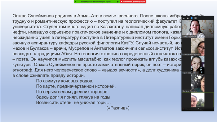 On May 19 2021, a curatorial hour was held with the 2nd-year students majoring in «Russian language and Literature», dedicated to Olzhas Suleimenov, the Kazakh poet, linguist, public and political figure, who is celebrating his 85th anniversary this year. He is a world-class personality, a great poet who has become the pride of the nation. Olzhas Suleimenov burst into the poetic orbit as quickly as the first man into space. A little-known reporter of the newspaper «Kazakhstanskaya Pravda» won a wide readership by writing a poem «Earth, bow to Man!» about Yu. Gagarin’s fligh. Since this event, his bright and temperamental poetry has found its many admirers in many parts of our planet. From the very first steps in literature, he praises freedom of thought and defends the truth. Through his work and creativity the poet teaches us to respect our ancestors, to be aware of our responsibility to our descendants. Today, he is faithful to his beliefs and the civic responsibility of the artist for his word. During the event, a presentation about Olzhas Omarovich’s life and work was shown, students watched an archive video with the poet's performances, and adviser Sayahmet Salika read an excerpt from the poem «Earth, Bow to Man!».
