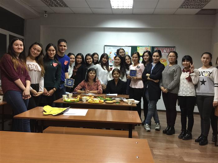 On November 9, 2016 teachers of the Foreign Languages Department A.Shayakhmet and G.Almabaeva held the educational cultural event «Thanksgiving Day» under the program "Айналаңды нұрландыр!" Second, third, and fourth year students of the Oriental Studies Faculty practiced their language skills, recited poetry, and took parts in role-playing scenes in English, showed their cultural knowledge, as well as cooperation and capability to help people.