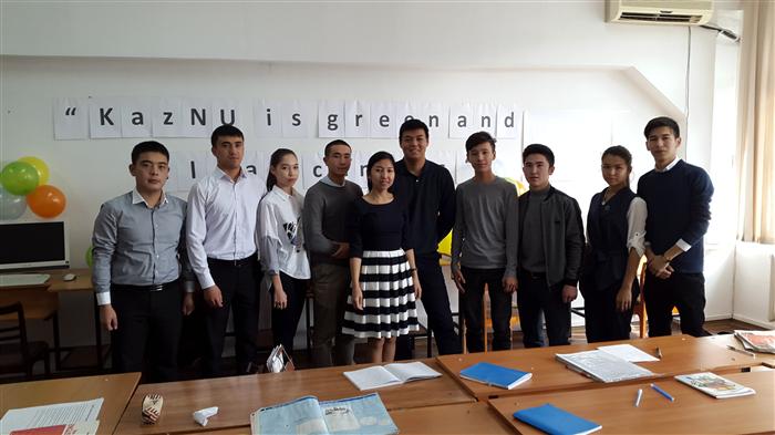 October 14, 2017, there was an educational event devoted to the university project "Green Campus!". The topic of the event was "KazNU is green and clean campus!». We organized an educational event with the students of the 1st course, 103, 104, 105 groups, Kazakh department, specialty - 5В030100 –“Jurisprudence”, in the Faculty of Law. In our educational event students decorated the room with balloons; their own posters dedicated to the topic, made and read their reports about the university and faculties, prepared proverbs about knowledge in English language and translated them into Kazakh. They drew their own emblem and explained what they have drawn in it. All students of the groups actively participated in the event.