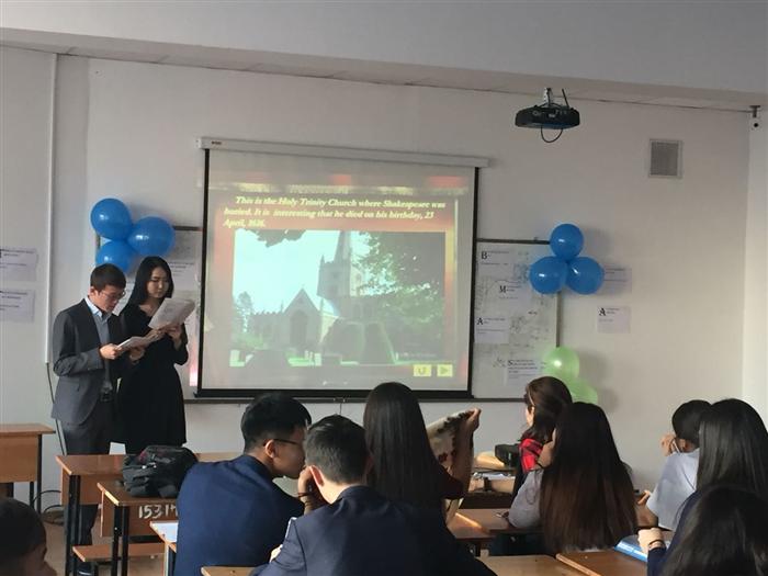Within the framework of the project "100 books" the English teacher, Dykhanova A.Sh., the educational event with the students of the Law Faculty. The event was called "Shakespeare’s Ball". It was dedicated to the great poet's life and literary works . All participants of the event spoke in English and Kazakh. Presenters of the event, Zhanashov Zhanibek and Zakanova Aidana talked about the importance of the great poet, recalled his great statements and briefly told about Shakespeare's works. Adil Asel and Temirbekova Aizhan made the presentation about Shakespeare’s biography. Kozhakova Nurai, Umbetov Bekzat, Kenzhibaev Nurzhan and Orazov Nurdaulet showed two scenes in English demonstrating various episodes from the life of the poet, and Kulekesh Zhanserik translated their speech into Kazakh. Then Kozhakova Nurai held a quiz with the audience devoted Shakespeare's literary works and biography. The culmination of the event was the scene from "Romeo and Juliet". They students showed two scenes from this play. The scene was at the ball and the second one was on the balcony. At the beginning of the play Kakenova Aliya and Sarsenova Laura recited poems from this tragedy. Baymenov Orazaly, Kozhakova Nurai, Bageev Bagdat and Sarsenova Laura performed a dance playing the heads of the families of Montague and Capulet at the ball. Kadyrov Berdimurat acted the role of Romeo, Kosaeva Albina acted the role of Juliet, and Құdaibergen Abzal and Musraliev Beksultan played Romeo's friends - Mercutio and Benvolio. After the scenes from the play: "Romeo and Juliet", Satan Toktar read Hamlet's famous speech. Also Bageev Bagdat, Omyrbek Asylkhan and Zhamantai Salamat recited Shakespeare's sonnets. At the end of the event, the teacher Dykhanova A.Sh. discussed Shakespeare's life and literary works, the importance of English in understanding his works with the students and noted the excellent students' language competence |