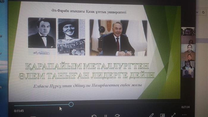 On December 1, 2020 the Senior Lecturer of the Department of Foreign Languages Atabaeva G.K. held an educational hour with 1st year master students of the specialty "7M01601 - History" of the historical, archaeological and ethnological faculties. The event was dedicated to The Day of the First President. During the event, the master students made reports about Elbasy’s life path , prepared the interesting videos about N.A. Nazarbayev’s life and career. They also shared information about the best projects initiated by Elbasy, defended their presentations. The merits of Nursultan Abishevich in the development of the country were analyzed, the results of the event were summed and the significance of the holiday was determined.