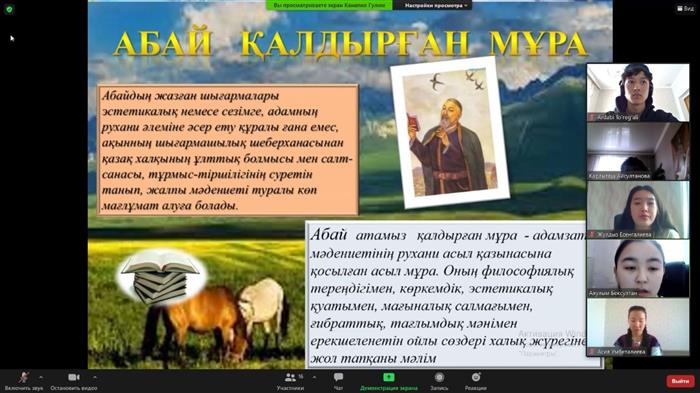 On December 18, 2020, within the framework of the English club "Lingua" on the ZOOM platform, the senior lecturer of the Department of Foreign Languages, Candidate of Philological Sciences, Aisultanova K.A. held an event dedicated to the 175th anniversary of the birth of the great poet and educator, Abai Kunanbayev. The event topic was Abay's heritage is a beacon of the nation's spirituality .During the event, the analysis of Abai's creativity was carried out to arouse the interest of Kazakhstani youth in the literature of their people . The 1st year students of the specialty "Psychology", Faculty of Philosophy and Political Science participated in the event. The students showed videos and slideshows about Abai’s heritage, which included songs and melodies of the great poet.