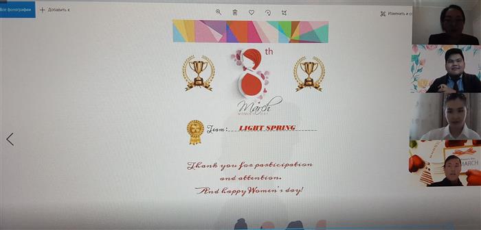 On March 2, 2021, Senior Lecturer of the Department of Foreign Languages of the Faculty of Philology Mombekova N.B. held an educational event dedicated to International Women's Day with first-year students of the specialty "Cadaster" on the ZOOM platform.