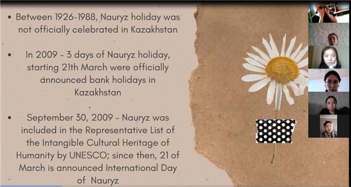 This time a student Rakymkul Aknur prepared a presentation in English about the origin and interesting facts of the Nauryz holiday. Kopbai Eldana made a Quiz on the knowledge of the history and traditions of Nauryz. In addition, Merey Bostan and Karina Seidakhmet recited poems dedicated to Nauryz in Kazakh and which they successfully translated into English. At the same time, the students demonstrated a high level of English proficiency. At the end of the meeting, Balnur Aizharyk and Aruzhan Zhaibosynova sang their favorite songs in the Kazakh language.