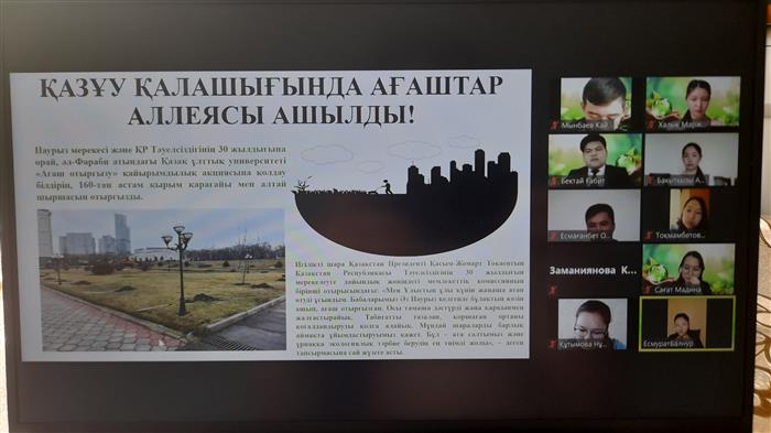 On May 5, 2021 at 14:00, within the framework of the «Green Campus» project, a round table was held among youth of the republican level "Protecting the nature – worrying about the future", Organized by the FacultyGeography and Environmental Sciences, Department of Land Management and Cadastre, speciality of ‘Cadastre’ students 1 course and senior teacher Shanbaeva Arailym Nurdygulovna.