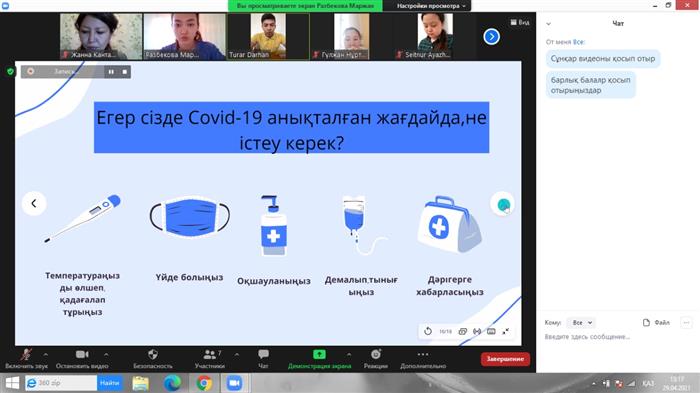 On April 29, 2021, 2nd year students of the specialty "Religious Studies" in an online format organized an event "Covid-19 Precautions" in connection with the spread of coronavirus in the world and in the country. The event discussed how the coronavirus originated and spread around the world. They discussed all the measures taken to prevent coronavirus in the Republic of Kazakhstan, what actions were taken. Also, they talked about the benefits of vaccination, and what preventive measures must be followed.