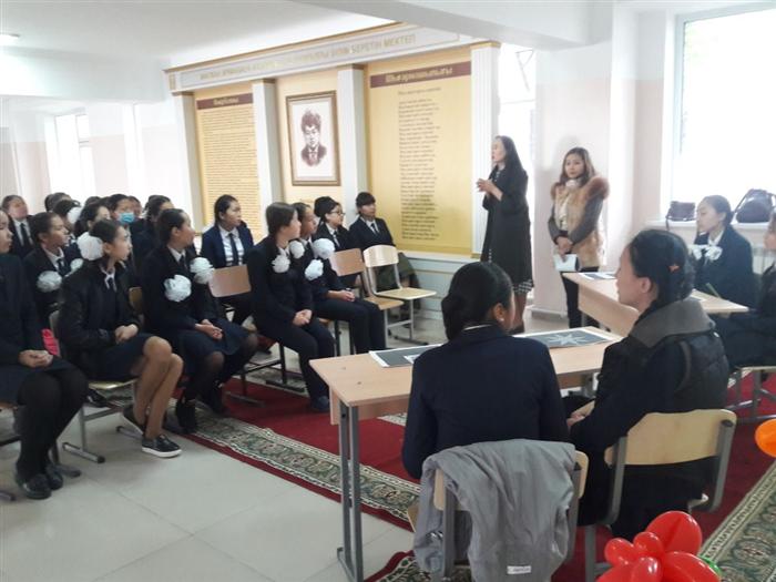 The schoolgirls of 9th form participated in the event. The main theme of the meeting was the image of a modern girl and her upbringing. At the meeting we talked about the education of girls in the family, the culture of girls' behavior and the qualities inherent in them. The girls wrote "noble" and "moral" qualities of human on the papers, then described them, answered the questions. We also talked about their bad habits, traits and they offered solutions. They discussed the Kazakh proverb "Қызға 40 үйден тыйым ". The students of the 9th form took an active part in the event, spoke openly their opinion, discussed the topic with special interest.