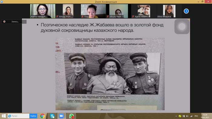 on the ZOOM platform with the 2nd year students of the specialty of religious studies, a curatorial hour was held, under the guidance of curator-adviser Zh.U. Kantarbayeva on the theme “175th anniversary of ZhambylZhabayev”. The theme of this curatorial hour was taken and prepared in connection with the significant date. A presentation was made with the content of the biography of the great Zhambyl, his works. A number of planned events dedicated to the birthday of the akyn were noted, and the anniversary of the house-museum of ZhambylZhabayev himself was also mentioned. Students remembered some details and learned new information. The curatorial hour passed in an informative and cognitive form and was fascinating.