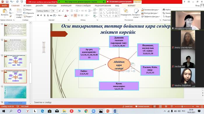 On March 15, 2021, an hour of educational meetings was held with students of the 2nd Year" Cultural Studies "within the framework of the project" 100 books " to discuss the words of edification of Abay Kunanbayev on the online Zoom platform