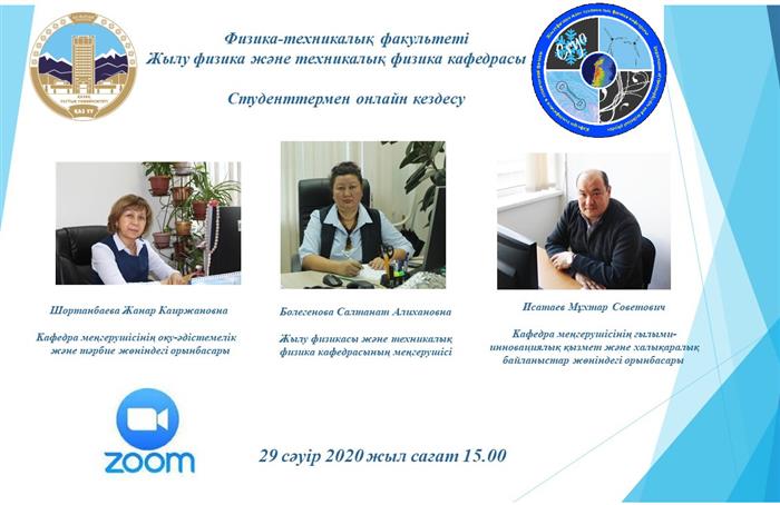 April 29, 2020, the leadership of the Department of Thermophysics and Technical Physics, represented by the head of the department S. A. Bolegenova, deputy head of the department for educational, methodical and educational work Zh. K. Shortanbaeva and M. Isataev, deputy head of the department for scientific and innovative activity and international relations S., an online conference was held for students of 1-4 bachelor's and 1-2 master's courses. The deputy dean for educational work Bolegenova Symbat Alikhanovna took part in the webinar. The leadership of the department answered all the students' questions of interest according to the rules of the summer examination session. The questions were mainly about the procedure for conducting a comprehensive exam, defense of graduation and master's theses.. In total, 99 students attended the webinar.