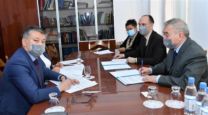Today, a Memorandum of mutual cooperation was signed between the Department of the Committee for Technical Regulation and Metrology in Almaty and the NJSC " al-Farabi Kazakh National University".First Vice-Rector of Al-Farabi KazNU Burkitbaev M.M. and Deputy Head of the Department of the Committee for Technical Regulation and Metrology in Almaty Kerimkulov K.I. discussed the prospects for joint training of specialists in the field of technical regulation.The meeting was attended by the chief specialist of the DCTRM in Almaty, Nysanbek А.A., the dean of the physics and technology faculty of KazNU Davletov A.E. and Head of the Department of Thermophysics and Technical Physics S.A. Bolegenova. The Department of Thermophysics and Technical Physics is a graduating department for the preparation of bachelors, masters and PhD doctors in the direction of training "Standardization, certification and metrology (by industry)".