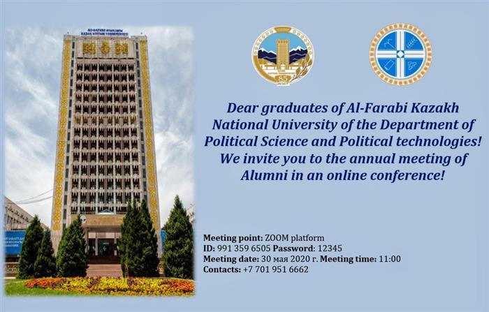 On May 30 at 11.00 a.m, Al-FarabiKazNU, Faculty of Philosophy and Political Science, Department of Political Science and Political Technologies will hold in online meeting dedicated to the «Day of Graduates of KazNU». Meetingpoint: Zoom platform Conference ID: 991 359 6505 Password: 12345 |
