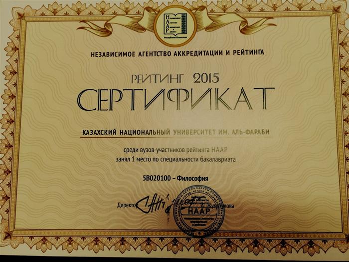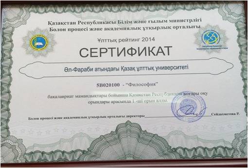 September 2018 Independent Agency for Quality Assurance in Education (NKAOKO) awarded the Kazakh National University named after al-Farabi 1st place in the ranking of educational programs of universities in Kazakhstan in 2018 under the program "5B020100-Philosophy". |