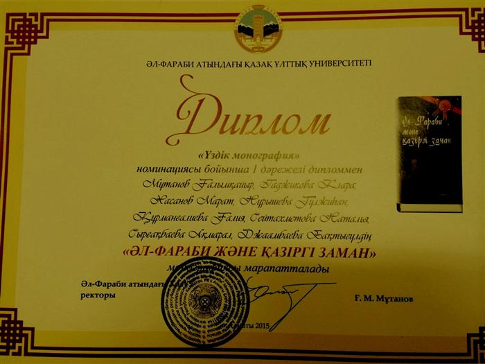 June 10, 2015 The work of "Al-Farabi and modernity", among the authors of the department Nurysheva G.Zh., Dzhaambaeva BA, Syrgakbaeva AS, was recognized as the winner in the nomination "The best monograph" of the socio-humanitarian direction of the competition for the best study Al-Farabi Kazakh National University |