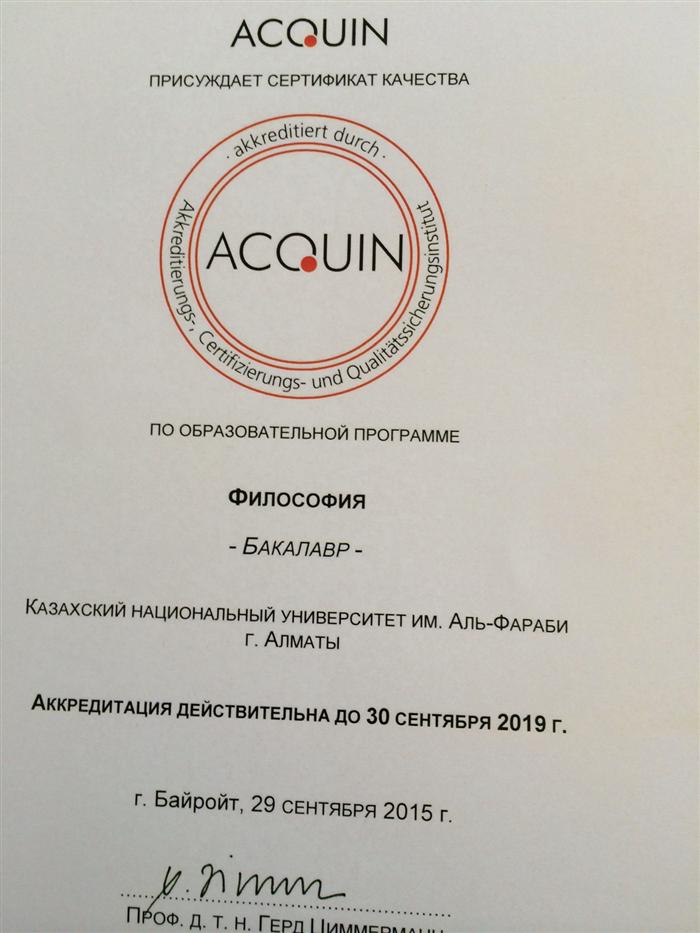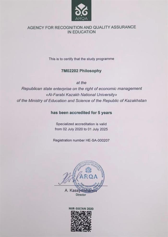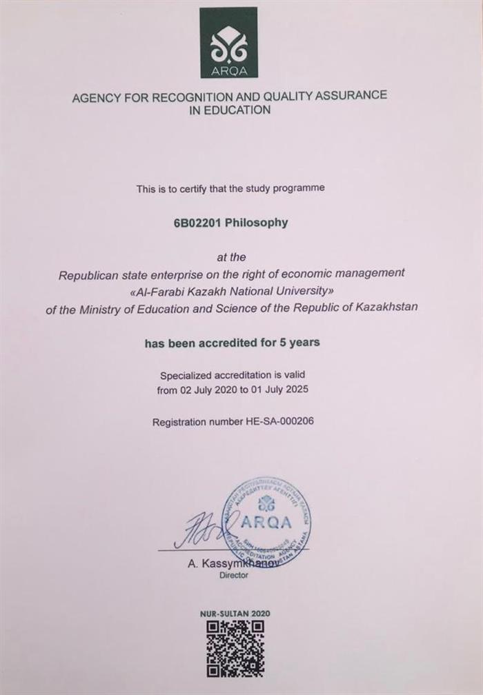 July 02, 2020 Educational program 07М02202 Philosophy are accredited for five years by ARQA by an independent agency for credits and examination of the quality of education.