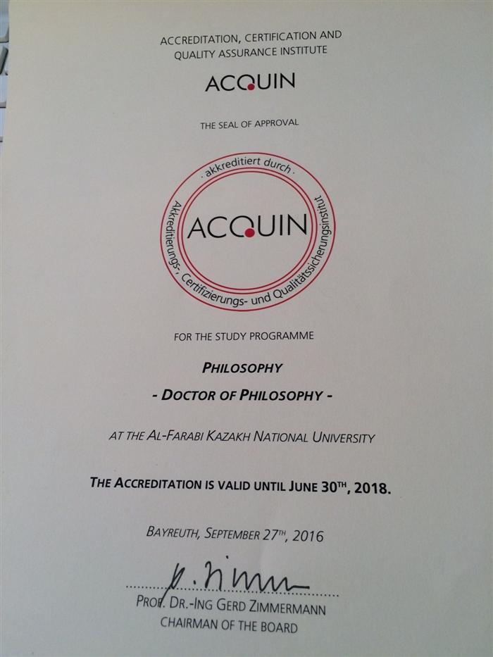 September 27, 2016 The educational program of the Department of Philosophy "Doctor of Philosophy" received a certificate from the Institute of Quality and Accreditation (Bayreuth, Germany)! |