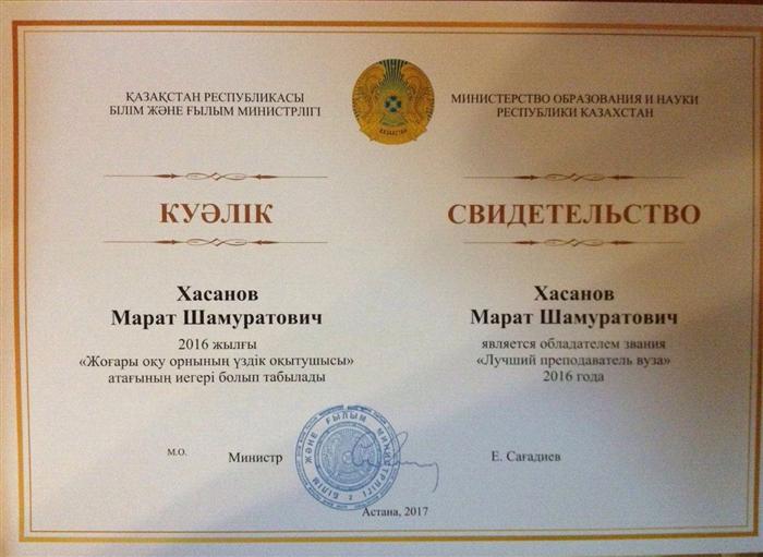Professor of the department Marat Shamuratovich Khasanov has been awarded the title of "Best Teacher of 2016"! |