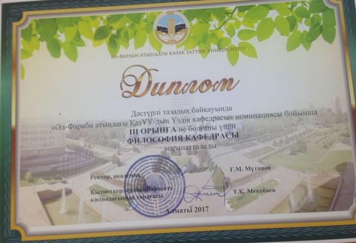 18.03. 2015. The Department of Philosophy took the third place in the nomination "Best Department" in the annual competition of purity, organized by the trade union "Parasat" KazNU named after al-Farabi |