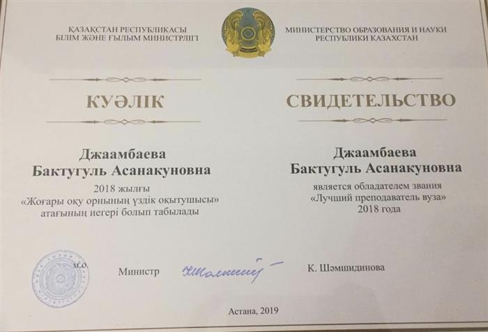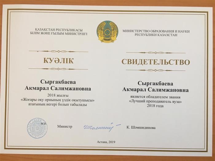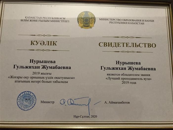 15.02.2019. Professor, Doctor of Philosophy Syrgakbaeva AS was awarded the title of "Best Teacher of the Year"! |