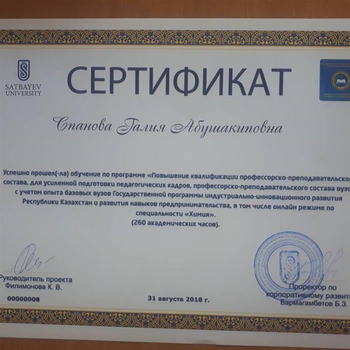 Ph.D., senior lecturer, Department of Chemical Physics and Materials Science, Faculty of Chemistry and Chemical Technology, Kazakh National University. Spanova G.A. successfully completed training under the program "Advanced training of teaching staff for advanced training of teaching staff, teaching staff of universities, taking into account the experience of basic higher education institutions of GPIID of the Republic of Kazakhstan and the development of entrepreneurial skills", 260 academic hours, 18 June-31 August, 2018