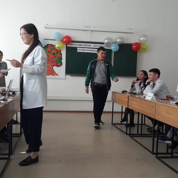 September 27, 2018, open intellectual lesson on the subject “Nanotechnology-Future Technologies” was held. Responsible curator-adviser of the Department of Chemical Physics and Materials Science Azat Seytkhan and students.