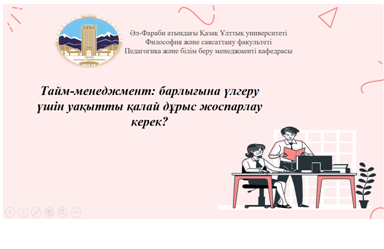 - Organizers: teachers of the Department of "Pedagogy and Management of Education": Bulatbaeva A. A., Ramazanova S. A., 1st year master's student of the specialty "Pedagogy and Psychology" Mashyrykova F.A.
