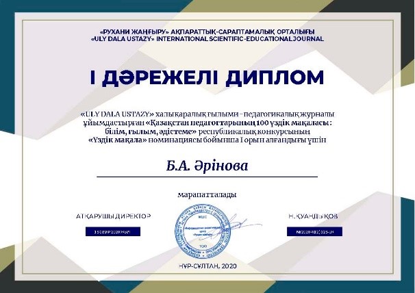 Department of Pedagogy and Education Management, Faculty of Philosophy and Political Science, KazNU Al-Farabi is training specialists in the specialty "Social pedagogy and self-knowledge" for secondary schools in the country. Students and undergraduates studying in this specialty pay special attention to the role of education and upbringing in a modern society based on national and universal values. And the fact that the theory of humane pedagogy in the new century is based on ideas formed in the traditional spiritual and moral heritage of mankind testifies to the virtuous direction of the subject "Self-cognition".Article of associate professor of the department of pedagogy and educational management, B.A. Arinova co-authored with 2nd year undergraduate I. Kabdoldina on the topic "Technology of humanization in education - the basis of spiritual and moral education in self-knowledge", organized by the teacher of the Great Steppe international scientific and pedagogical journal, took 1st place in the Republican contest “100 best articles of teachers of Kazakhstan: education, science, methodology” in the nomination “Best article”. We believe that the Diploma for the 1st place of the Information and Analytical Center "Spiritual Revival" and the International Scientific and Educational Journal ULY DALA USTAZY is one of the achievements of the 80-year history of our department. We wish the authors further fruitful work and creative success.