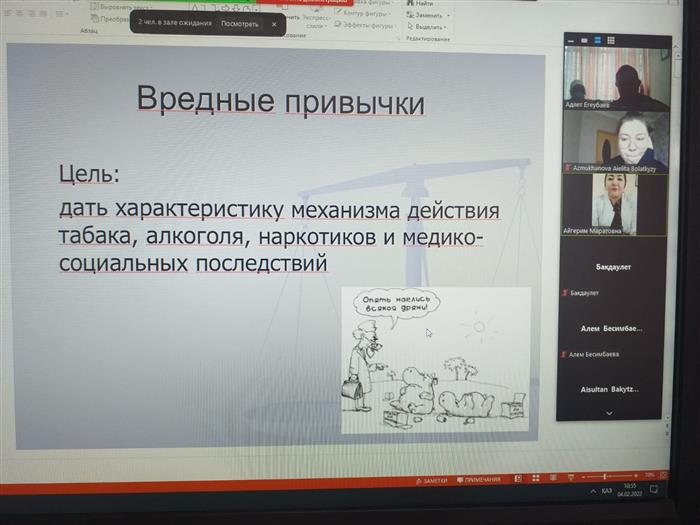 In accordance with the annual plan of educational work with students of the college of Al-Farabi Kazakh National University in the direction of healthy lifestyle and physical culture 04.02.2022, a specialist of the youth health center "Ak Zhol" Suleimenova Aigerim Maratovna conducted a webinar on the ZOOM platform "bad habits" and the strain "Omicron".