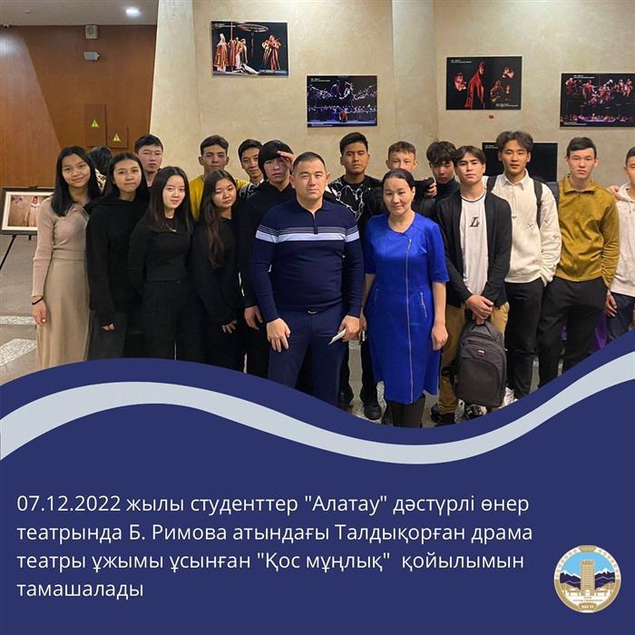 Students of the College of KazNU named after Al-Farabi 07.12.2022 B in the Theater of Traditional Art "Alatau". The staff of the Taldykorgan Drama Theater named after Rimov watched the play "Double Sadness". The speech highlighted the issue of the elderly and drug addiction, violence among adolescents, which is an urgent social issue, as work with a rich, educational meaning.