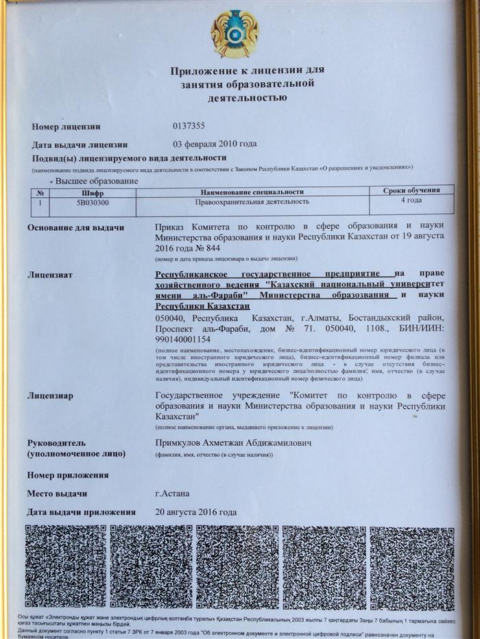 The Department received a license for educational activities in the specialty 5В030300 - Law Enforcement