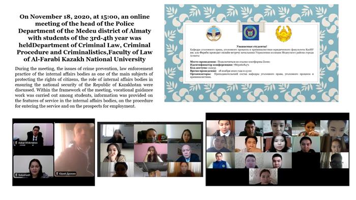 On November 18, 2020, at 15:00, an online meeting of the head of the Police Department of the Medeu district of Almaty with students of the 3rd-4th year was heldDepartment of Criminal Law, Criminal Procedure and Criminalistics,Faculty of Law of Al-Farabi Kazakh National University
