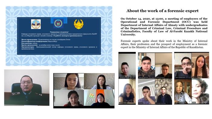 On October 14, 2020, at 13:00, a meeting of employees of the Operational and Forensic Department (OCU) was held Department of Internal Affairs of Almaty with undergraduates of the Department of Criminal Law, Criminal Procedure and Criminalistics, Faculty of Law of Al-Farabi Kazakh National University.