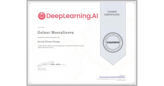 According to the global platform - Coursera in our university, students are given the opportunity to take free courses in various fields. Doctoral students of the Meteorology curriculum Musralinova Gulnur, Makhambetova Meruert successfully completed the AI and Climate Change course on the Coursera platform. This course discussed the mechanisms of anthropogenic climate change and its impact on global temperature and weather. Two specific examples are considered on these topics, one using time-series analysis to predict wind energy and the other using computer vision to monitor biodiversity. Both examples are based on artificial intelligence methods, that is, they are part of the solution to the problems of reducing climate change and adaptation.