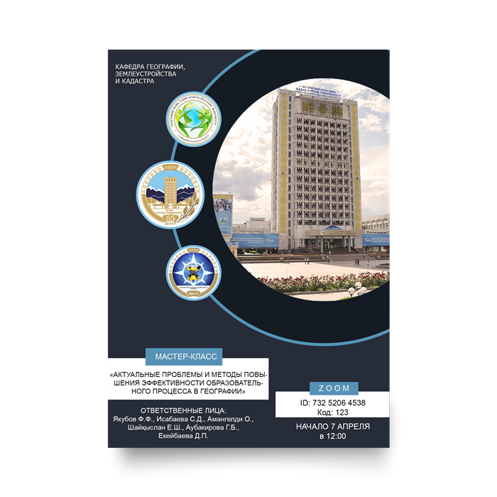 1. Master class "Actual problems and methods of improving the effectiveness of the educational process in geography". Responsible persons: doctoral students Yakubov F. F., Isabaeva S. D., Amangeldi O., Shaikyslan E. Sh., Aubakirova G. B., Ekeybayeva D. P.