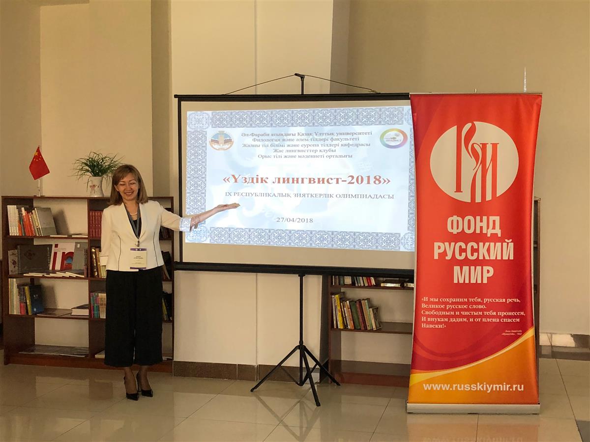 It is recalled that one of the main tasks of modern education is the education of a multilingual competitive specialist, capable of dynamically orienting himself in a new linguistic, political, economic and social environment. In this regard, a number of events (olympiads, contests, round tables, seminars, etc.) are held in one of the leading universities of the country - the Kazakh National University, among which the special place is the annual intellectual Olympiad «the best linguist - 2018» which conducted within the framework of the "Young Linguist" club's activity of the Department of General Linguistics and European Languages of KazNU and the Center for Russian Language and Culture at the University (Director, Ph.D. Umatova JM). Members of the club are students, undergraduates, PhD students which interested in the problems of modern linguistics. The scientific advisors of the club are the teachers of the department - Doctor of Philology Zh.K. Ibraeva and Candidate of Philology M.K. Mambetova. The Olympiad is held with the purpose of revealing and developing students' creative abilities and interest in research activities, promoting knowledge of languages, and promoting the professional orientation of future specialists.