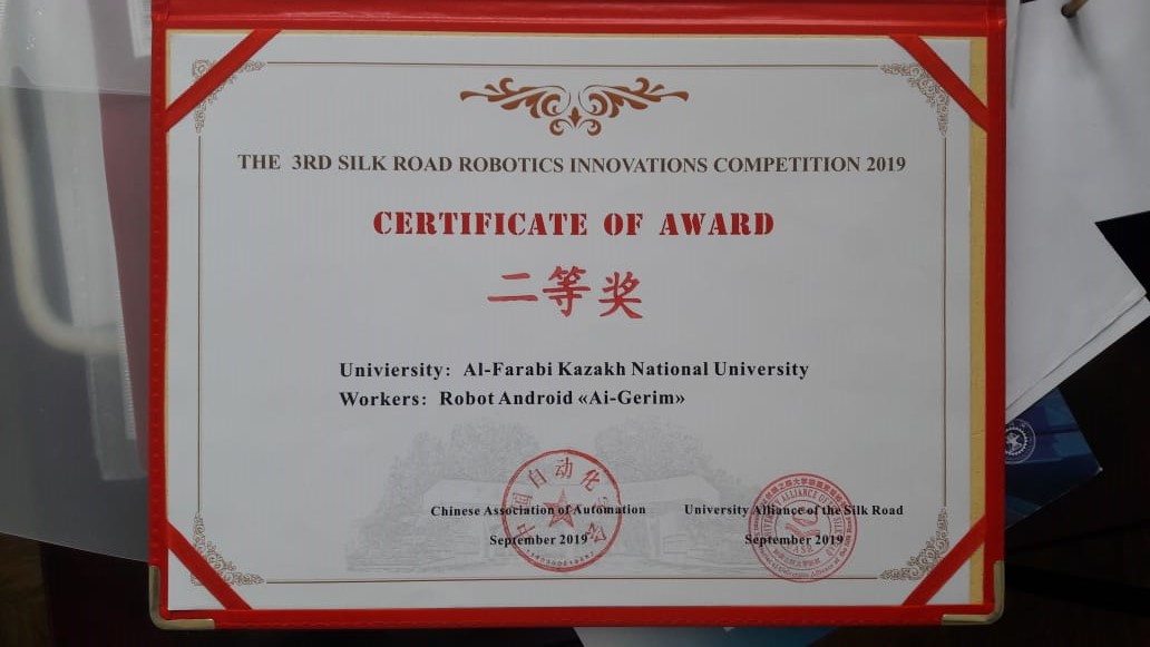9/20/2019The KazNU team participated in the 2019 Silk Road Robotics Innovation Competition (SRRIC) of Xi'an, China and was awarded the Competition Diploma.