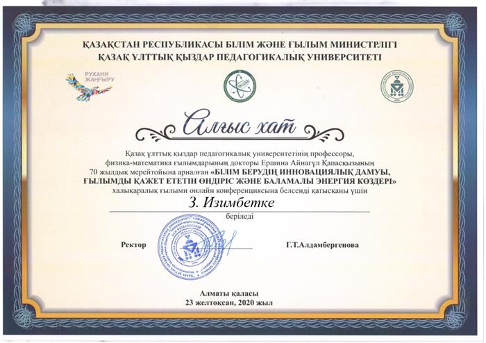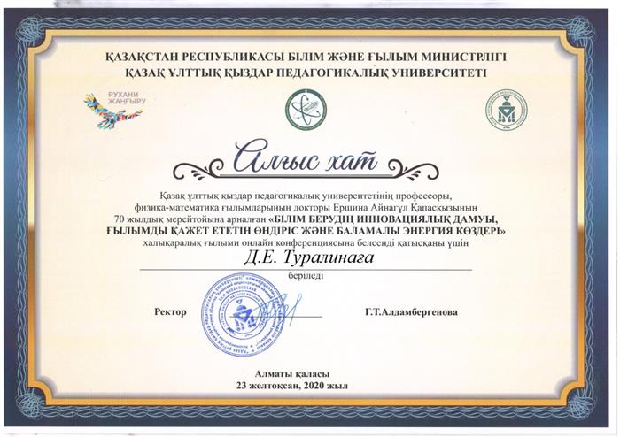 On December 23, 2020, the International Scientific Conference "Innovative development of education, high-tech production and alternative Energy sources" was held at the Kazakh National Women's Pedagogical University. The conference was dedicated to the 70th anniversary of the birth and 45th anniversary of the scientific and pedagogical activity of Professor Ershina Ainakul Kapasovna.