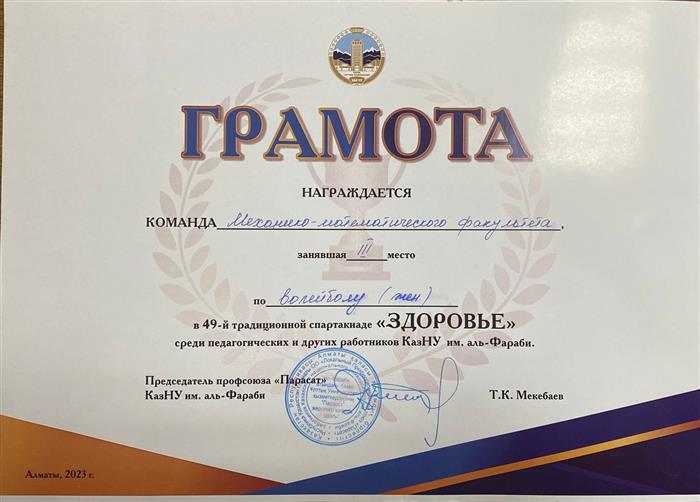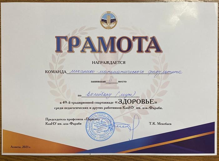 In the traditional 49th Sports Contest of Al-Farabi Kazakh National University “Health", volleyball competitions among university teachers and staff were held from January 4 to 12. At this event, the Faculty of Mechanics and Mathematics took II place among men and III among women. The winners were awarded by the chairman of the “Parasat” trade union of Al-Frabi Mekebayev T. K. KazNU with diplomas and prizes.