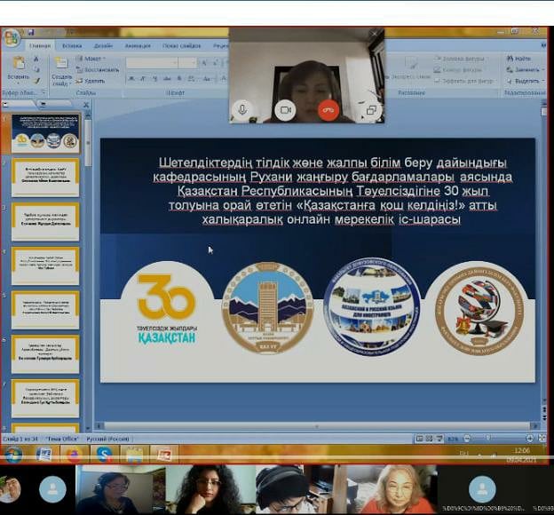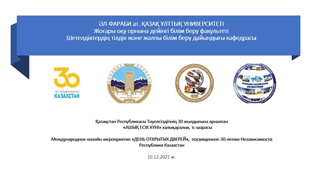 12/10/2021Traditionally, at the beginning of December, an open Day is held at the Department of Language and General Education Training of Foreigners as part of the "Festival of Languages and Cultures". This is an educational event of international level. This year the event was dedicated to the 30th anniversary of independence of the Republic of Kazakhstan and was held in an online format. In addition to students and teachers of the Department, the Open Day was attended by official guests: Director of the Department of International Cooperation of the Al-Farabi Kazakh National University Yerkezhan Apsemetova, Director of the Internationalization and Recruiting Council of the Al-Farabi Kazakh National University Arslan Mehmet, Consul of Science, Technology and Education of the Consulate General of the People's Republic of China in Almaty Zhang Wei, representative of the Japanese University of Tsukuba, (Tsukuba) Takeshi Ninomiya. A friendly warm greeting was received in Kazakh from a student of the Moscow Linguistic University. The students currently teaching at the department demonstrated their talents by reading poems and singing songs.