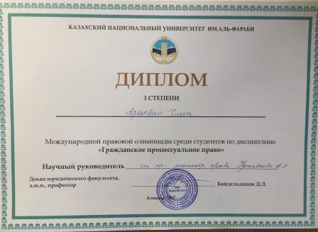 Arapbay Umіt Diploma of the I degree of the International Law Olympiad among students in the discipline "Civil Procedure Law" Almaty, 2017 |