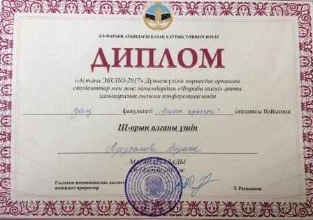 Auezkhanova Aidana Diploma of III degree in the International Scientific Conference of students and young scientists “World of Farabi” dedicated to the World Exhibition “Astana EXPO-2017”. Almaty, 2017 |