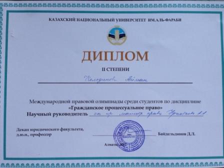 Keldinova Ayman Diploma of the II degree of the International Law Olympiad among students in the discipline “Civil procedure Law and Labor Law”. Almaty, 2017 |