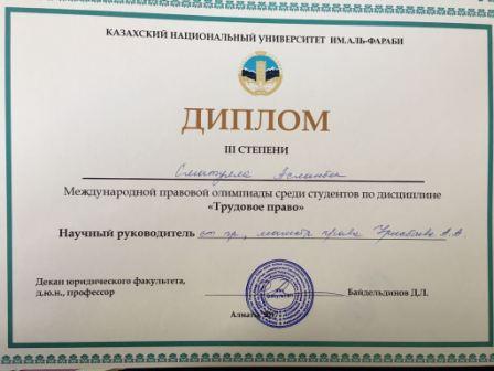 Smatulla Aslanbek Diploma of the III degree of the International Law Olympiad among students in the discipline “Labor law” Almaty, 2017 |