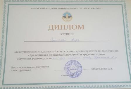 Saymasay Aida Diploma of the I degree of the International Student Conference among students in the discipline “Civil Procedure Law and Labor Law”. Almaty, 2017 |