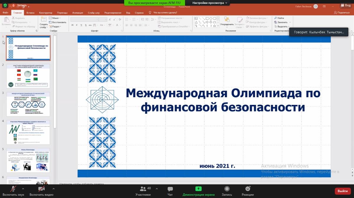 6/11/2021On June 11, 2021, an online meeting was held with representatives of the Agency of the Republic of Kazakhstan for Financial Monitoring, dedicated to the organization of the International Olympiad on financial security. The goals of the Olympiad are aimed at improving the information, financial, legal literacy and cultural level of young people. The meeting was attended by students and faculty of the Higher School of Economics and Business, the Faculty of International Relations, the Faculty of Information Technology and the Faculty of Law. The Olympiad is organized by JSC "Financial Academy" together with the International Network Institute in the field of AML/CFT and the first qualifying stage is held until June 15, 2021.