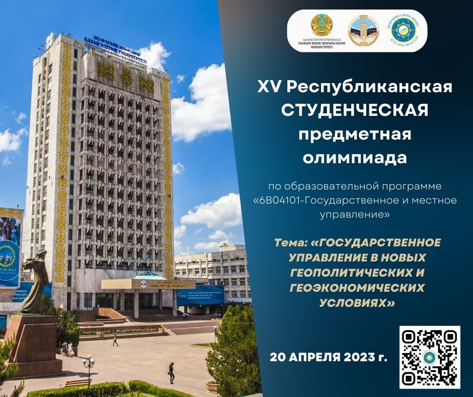 Department of "Management" al-Farabi Kazakh National University announces the holding of the XV Republican student subject Olympiad on the educational program "6B04101-State and local government" on the topic: «STATE ADMINISTRATION IN NEW GEOPOLITICAL AND GEOECONOMIC CONDITIONS».