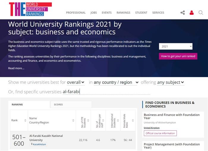According to the results of the “Times Higher Education World University Rankings by Subject 2021” subject rating, Al-Farabi KazNU improved scientific indicators and strengthened its position in a number of specialties.